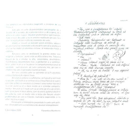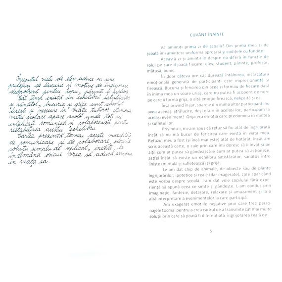 "Ganduri din prima zi de scoala" este o povestire in care autorul a surprins gandurile tuturor celor care vin la scoala la inceputul de an scolar: copii, parinti, profesori, directori. Fiecare capitol e o poarta spre cunoastere, intelegere, vindecare, iertare, explorare si depasirea limitelor. Prin scrierea de mana, cu o penita lata asemanatoare tocurilor de caligrafie folosite candva, cartea creeaza o stare emotionala diferita fata de cea cu care suntem obisnuiti cand citim o carte scrisa cu litere de tipar.